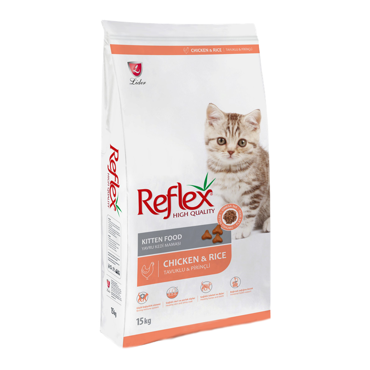 غذای گربه کیتن با طعم مرغ رفلکس متناسب با ذائقه و نیازهای غذایی بچه گربه ها طراحی شده و حاوی انواع ویتامین ها، امگا ۳، امگا ۶ و تورین است.