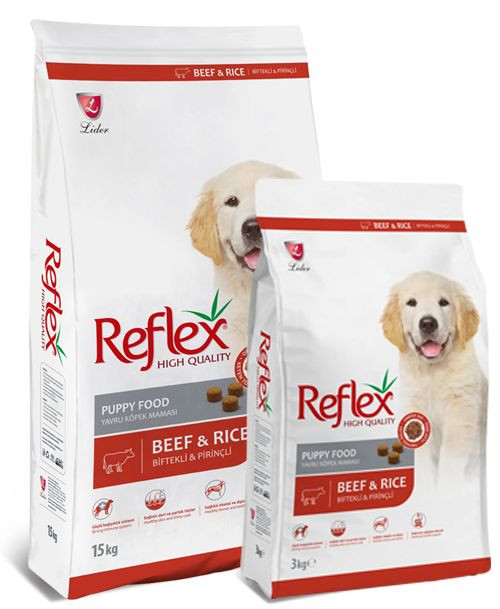 غذای خشک رفلکس پاپی طعم گوشت (Reflex Puppy Food with Beef) با طعم گوشت گاو، غذایی خوش طعم و مناسب و متعادل سگ، که حاوی پروتئین و فرموله شده برای تامین نیازهای ضروری رشد عضلات و استخوان پاپی ها است. همینطور در این محصول از تخم کتان برای تامین امگا 3 و 6 ، و از گیاه یوکا برای افزایش جذب مواد مغذی و تقویت سیستم ایمنی سگ استفاده شده است. و الیگوساکارید در محصول باعث بهبود عملکرد سیستم ادرار سگ میشود.