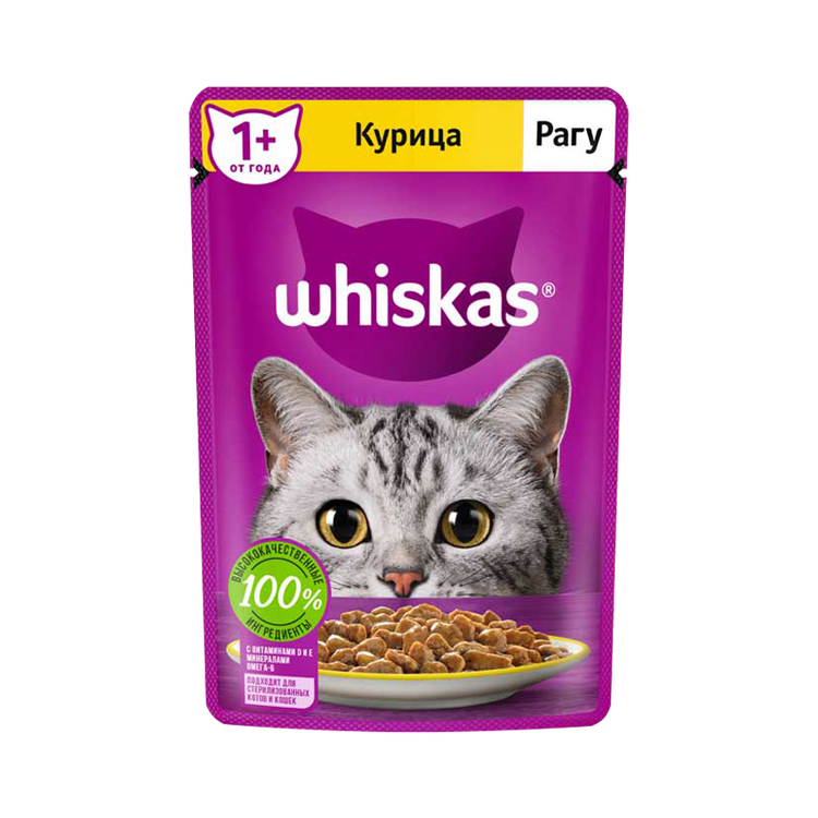 پوچ گربه با طعم مرغ ویسکاس حاوی یک وعده غذایی کامل و مغذی میباشد با طعم مرغ که داخل آب گوشت غلیظ شده قرار داده شده است. این خوراک ویژه ی گربه های بالغی میباشد که بالای 12 ماه سن دارند.
