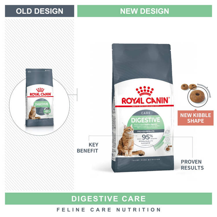 غذای خشک گربه رویال کنین مدل دایجستیو غذایی کامل و متعادل برای مراقبت از دستگاه گوارش در سنین ۱ تا ۷ سالگی است. اگر در ظرف خاک گربه شما مقدار زیادی مدفوع با بوی بسیار بد و یا شل وجود دارد، باید بدانید احتمالاً دستگاه گوارش حساسی دارد. احتمال دیگر این است که غذای خود را با سرعت خیلی زیاد می خورد و موجب می شود که هضم و جذب آن به خوبی انجام نشود. در این شرایط بهتر است از غذای مناسب برای گوارش حساس استفاده کنید.ویژگی های غذای خشک گربه رویال کنین مدل دایجستیو فرموله شده برای حمایت و مراقبت از دستگاه گوارش گربه بالغ (۱ تا ۷ سال) هضم آسان: فرمول ویژه مراقبت گوارشی حاوی پروتئین های با قابلیت بسیار بالا (L.I.P. *). همچنیت حاوی ترکیبی از پربیوتیک ها (FOS: فروکتو-الیگوساکاریدها) و فیبرهای خوراکی (از جمله psyllium) برای کمک به حفظ تعادل فلور روده و تنظیم ترشحات روده کیبل (دانه های کروکت) حلقه ای شکل که موجب جویدن طولانی تر و در نتیجه هضم بهتر غذا میگردد حاوی سطح بالانس شده مواد معدنی برای کاهش فشار بر کلیه ها و مراقبت از سلامت دستگاه ادراری