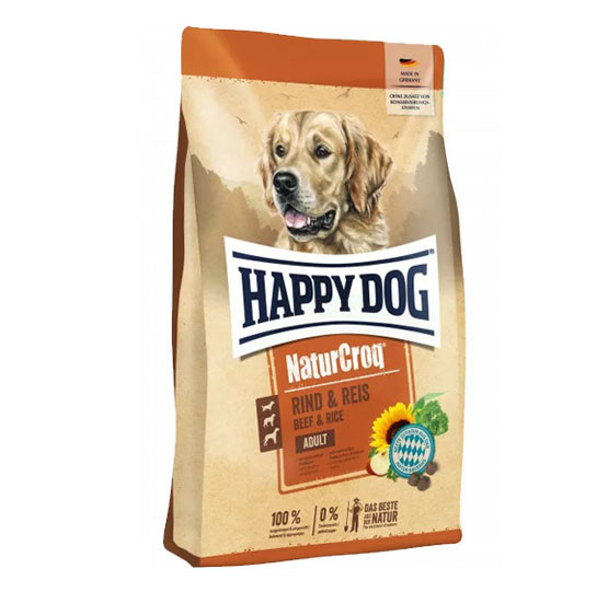 غذای خشک نیچرکراک هپی داگ با گوشت بی نظیر گاو به همراه برنج زود هضم و غلات کامل برای همه سایز سگ های بالغ نیز فرموله شده است که به عملکرد دستگاه گوارش نیز کمک می کند.