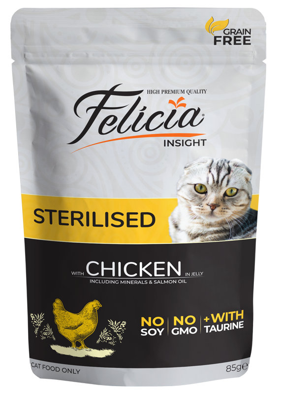 سوپ گربه عقیم فلیسیا طعم مرغ در ژله حاوی مقادیر زیادی گوشت واقعی، آب گوشت و تورین اضافی است که برای رفع نیازهای تغذیهای گربههای عقیم طراحی شده است.