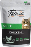 سوپ گربه فیلیسیا طعم گوشت مرغ در ژله حاوی مقادیر زیادی گوشت واقعی، آب گوشت و تورین اضافی است که برای رفع نیازهای تغذیهای گربههای بالغ طراحی شده است.