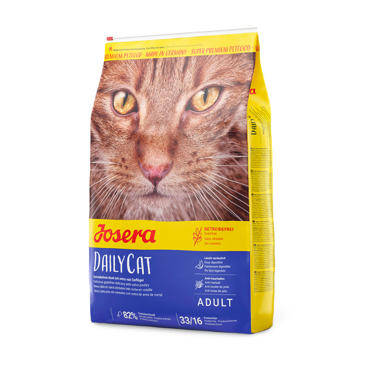 غذای خشک گربه دیلی کت حساس به غلات جوسرا (Josera Dailycat Grain Sensitive) وزن 10 کیلوگرم یک محصول ویژه بدون غلات ، ویژه گربه های بالغ کم تحرک خانگی و خارج از خانه می باشد. در این محصول به جای غلات از پروتئین با کیفیت و با فیبرهای طبیعی، نخود فرنگی و همچنین سیب زمینی است که منبع انرژی بالا و دارای خاصیت ضد حساسیت می باشد.. این محصول شامل تفاله چغندر است که منبع عالی فیبر است و برای باکتری هایی که روده بزرگ حیوان خانگی شما را سالم نگه می دارند بسیار مفید است. شامل تورین بوده که یک اسید آمینه حیاتی برای گربه ها است که مسئول حفظ بینایی تیز، سلامت قلب و بافت عصبی حیوانات خانگی است. این محصول بدون افزودن گندم، سویا، شکر یا لبنیات، بدون رنگ مصنوعی، طعم دهنده یا مواد نگهدارنده است.