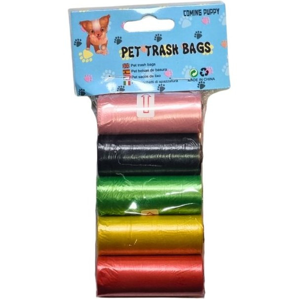 کیسه جمع آوری مدفوع حیوانات یک وسیله ضروری برای حیوانات خانگی مانند سگ، گربه، خرگوش و… می باشد. این محصول یک وسیله کاربردی برای جمع آوری فضولات حیوان به خصوص در هنگام پیاده روی به حساب می آید. در هر بسته ی این محصول 5 رول کیسه رنگی قرار دارد که دارای خط برش می باشند.