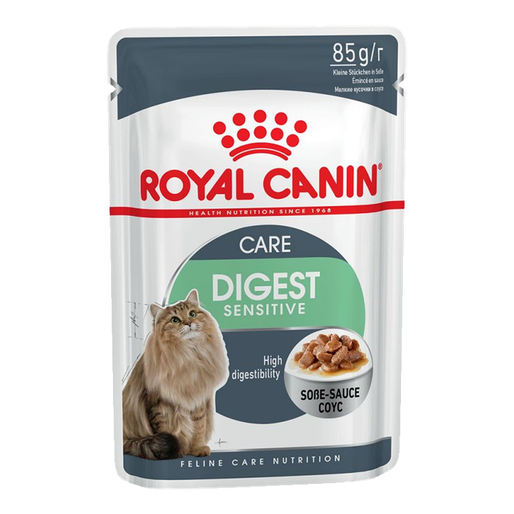 رویال کنین معتقد است که رژیم غذایی گربه باید تمام پارامترهای زندگی، از جمله سن، نژاد، سبک زندگی، فیزیولوژی و شرایط فردی را در نظر بگیرد. Royal Canin Digest Sensitive یک غذای گربه سالم بر اساس تعهدات رویال کنین به با بالاترین کیفیت غذایی است و شامل ویژگی های غذایی ماکرو (Macro Nutrient Profile) می باشد که اولیت گربه های بالغ ( از سن 1 سالگی ) است. گربه بالغ به طور غریزی غذایی با ویژگی های غذایی ماکرو را انتخاب می کند، که منجر به پذیرش طولانی مدت غذا می گردد و این امر بسیارمهم است, زیرا باوجود سالم و مفید بودن یک غذا, اگر گربه تمایلی به خوردن آن نداشته باشد, فایده ای ندارد. Royal Canin Digest Sensitive غذایی با فرمول تعدیل شده برای گربه هایی با حساسیت های تغذیه ای است. این غذا منجر به ترویج هضم بالا و تقویت دستگاه گوارشی حساس ، همچنین کاهش بوی مدفوع می گردد. گربه بالغ، به خصوص گربه عقیم شده ، در معرض خطر ابتلا به سنگ ادراری می باشد. Royal Canin Digest Sensitive سلامت سیستم ادراری را با کمک کاهش غلظت مواد معدنی که می تواند به تشکیل سنگ ادراری منجر گردد را ترویج و تقویت می نماید. محتوای بالای اسیدهای چرب ضروری سلامت و بشاش بودن گربه را تامین نموده و محتوای انرژی متوسط غذا به حفظ وزن ایده آل گربه کمک می کند. غذای مرطوب Royal Canin Digest Sensitive حاوی تکه های آبدار غذا در یک سس خوشمزه است. بسته های پوچ عطر و طعم کامل مواد غذایی را حفظ کرده و از کیفیت بالای مواد مغذی آن حفاظت می کند. در عین حال باز کردن آنها بسیار آسان است